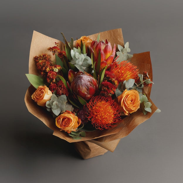 Vibrant, bold, and full of warmth — the Autumn Ember Bouquet captures the essence of the season in a stunning symphony of burnt orange, amber, and rustic red tones. Featuring a rich mix of orange roses, proteas, pincushion blooms, and seasonal foliage, this bouquet is a perfect reflection of autumn’s golden beauty.