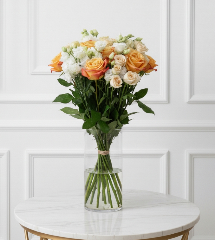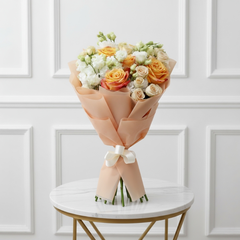 Soft, elegant, and full of warmth, the Peach Sorbet Bouquet features a delicate blend of peach and cream roses, paired with fresh white lisianthus and touches of seasonal foliage. Each bloom is hand-picked for its freshness and arranged with care by our expert florists to create a bouquet that radiates sophistication and charm. The pastel peach wrapping and satin ribbon complete this luxurious design — a perfect gift for birthdays, anniversaries, or heartfelt celebrations.