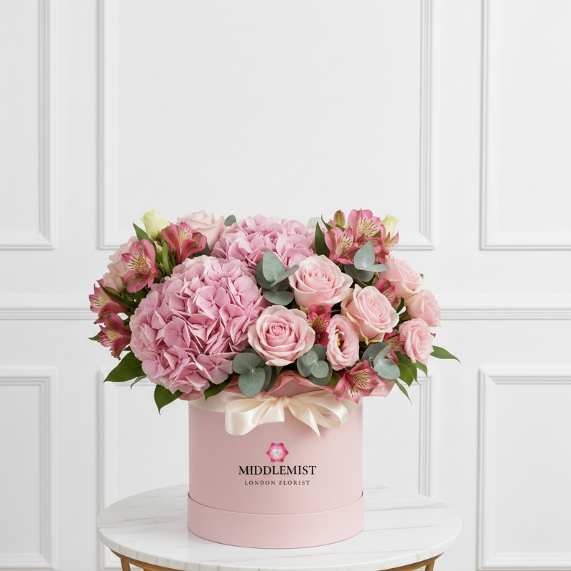 A vision of romance and elegance, this exquisite flower box is filled with lush pink roses, delicate hydrangeas, and charming spray roses, perfectly complemented by soft alstroemeria and fresh eucalyptus. Wrapped in a pastel pink hatbox with a luxurious satin ribbon, this arrangement is a timeless expression of love, grace, and appreciation.