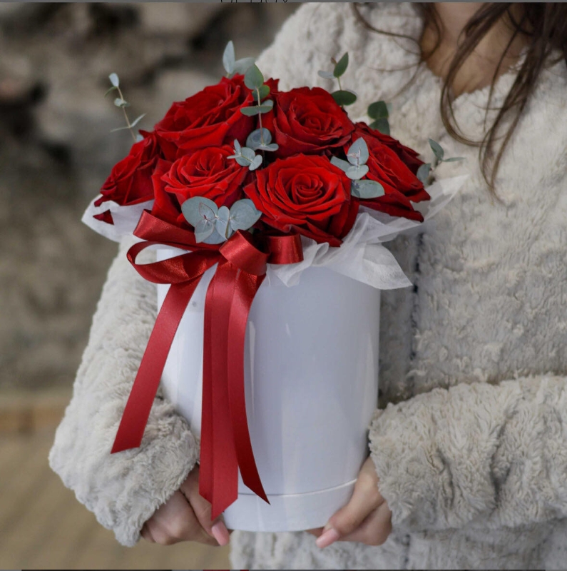 Each red rose is handpicked for its velvety petals and rich hue, while the aromatic eucalyptus adds a modern, refreshing touch. Beautifully arranged in a sleek, white flower box and tied with an exquisite red satin ribbon, La Rose Flower Box is a masterpiece of grace and charm.