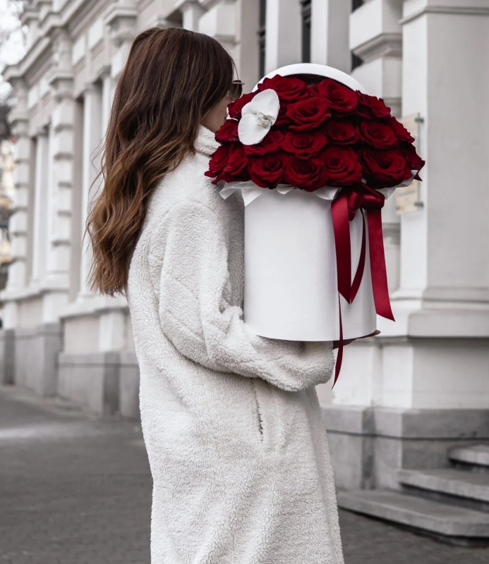 A masterpiece of romance and elegance, the Eternal Scarlet & Orchid Hatbox is a luxurious floral arrangement featuring lush deep red roses complemented by a single delicate white orchid. This striking contrast symbolises both love and purity, making it the perfect statement gift. Presented in a sophisticated white hatbox, elegantly tied with a satin ribbon, this arrangement embodies timeless beauty and refinement.
