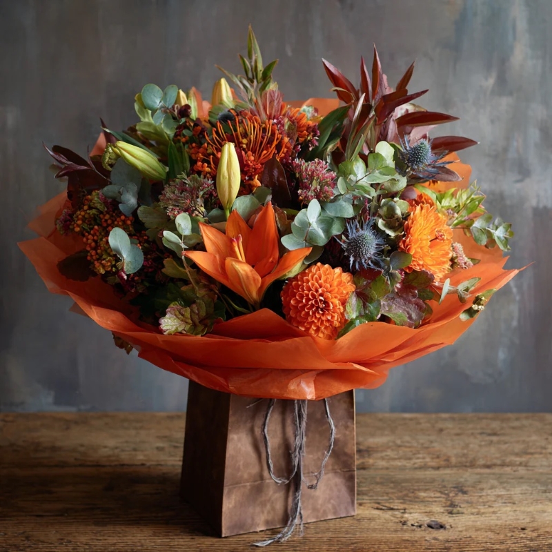 Wrapped in autumn-toned paper and tied with a deep plum ribbon, this bouquet brings the essence of the season indoors. Perfect for birthdays, thank-you gifts, housewarmings, or as a centrepiece for autumn celebrations