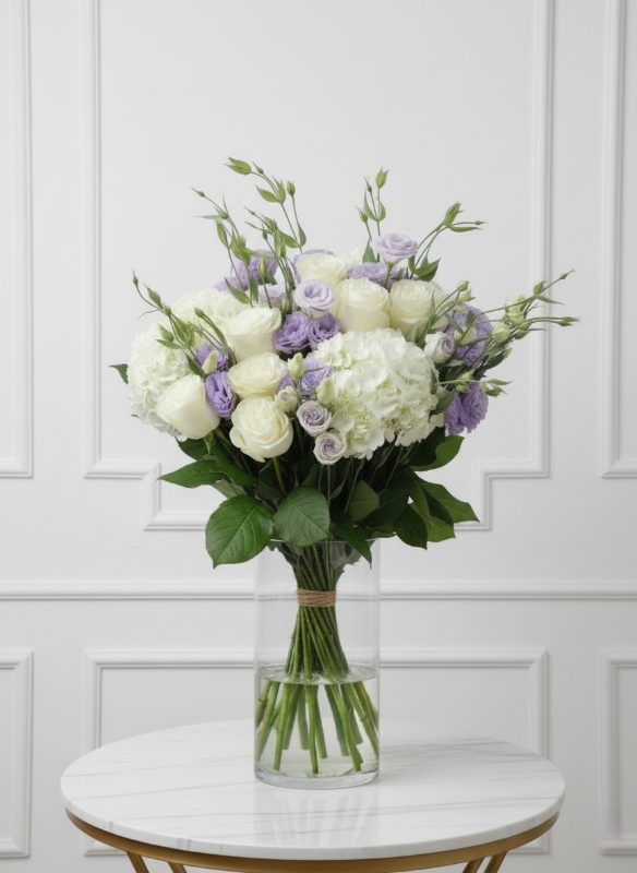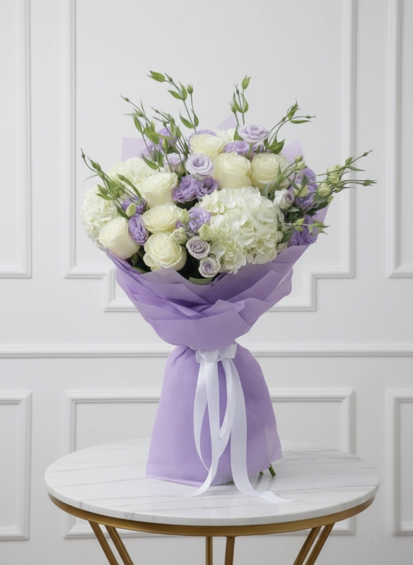 Elegance and tranquillity come together in this stunning floral arrangement, featuring a soft blend of creamy white roses, hydrangeas, and delicate lavender lisianthus. Wrapped in gentle lilac hues and finished with a luxurious white satin ribbon, it is the perfect gift for expressing love, gratitude, or admiration.
