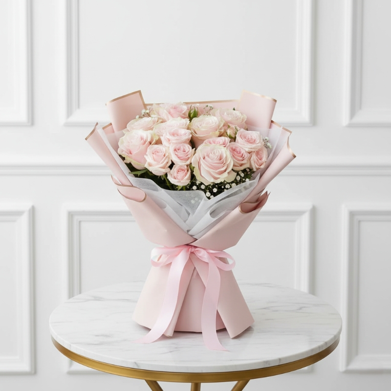 Soft, romantic, and effortlessly elegant, the Rose Whisper Bouquet combines the delicate beauty of pearl pink Mondial roses and pink spray roses, accented with touches of gypsophila (baby’s breath) for a dreamy, airy finish. Each bloom is hand-picked for freshness and artfully arranged by our expert florists, creating a graceful display that captures timeless romance. Wrapped in soft blush paper and finished with a satin ribbon, this bouquet makes the perfect gift for birthdays, anniversaries, or heartfelt celebrations.