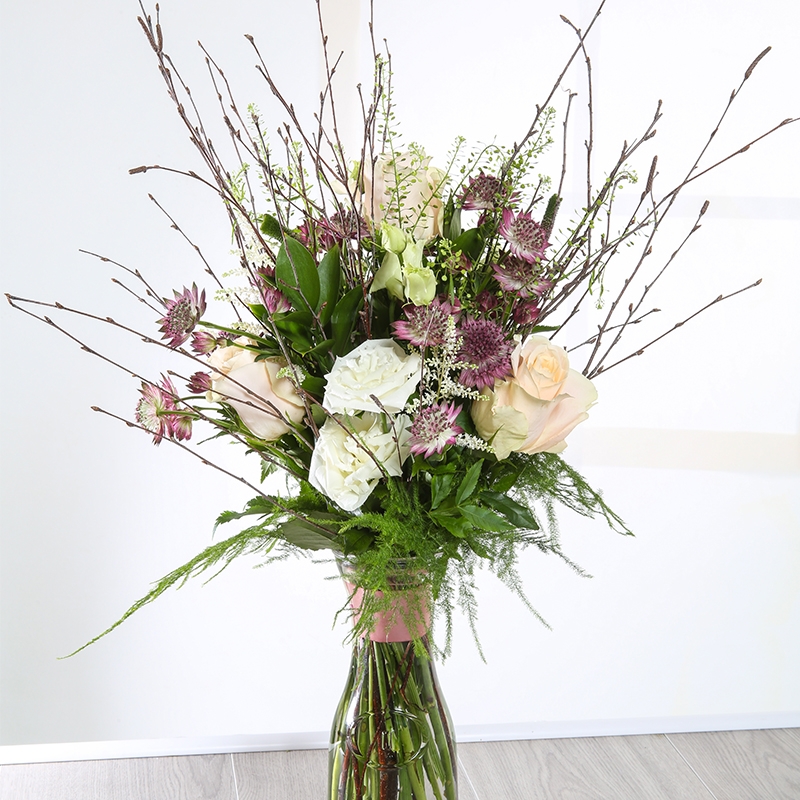 A beautiful arrangement of pale pinks and natural greenery, including Roses, Astrantia and Lisianthus.