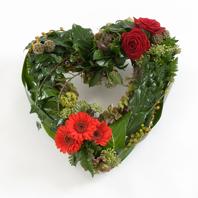 A contemporary designed heart using mixed foliage, leaves and flowers.
