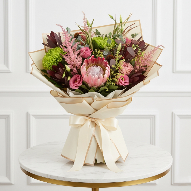 Make a statement with the striking Exotic Protea Bouquet, a captivating mix of King Protea, pink lisianthus, green chrysanthemums, and burgundy foliage. Every stem is hand-picked and artistically arranged by our expert florists, creating a truly unique bouquet that blends texture, colour, and sophistication.
