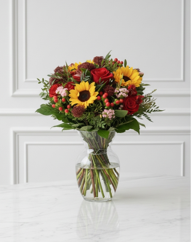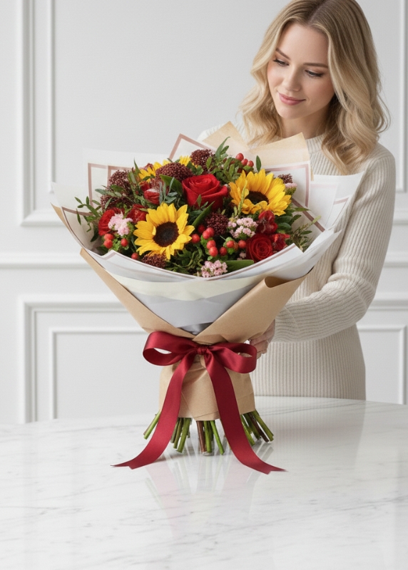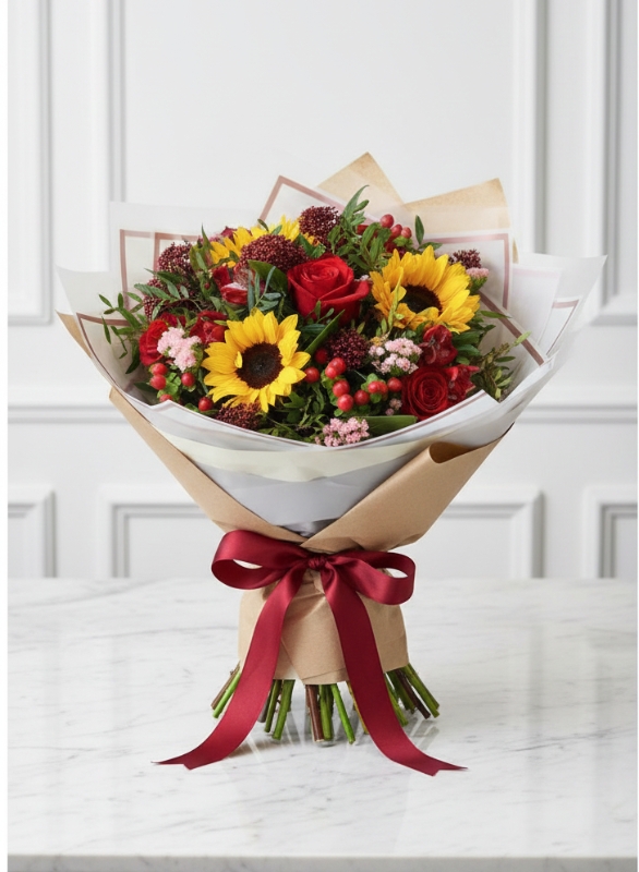 The Scarlet Sunray Luxury Bouquet is a bold and joyful floral arrangement designed to make a lasting impression. Showcasing radiant sunflowers as its centrepiece, this bouquet is beautifully complemented by velvety red roses, textured seasonal flowers, and fresh greenery, creating a striking balance of warmth, passion, and elegance.