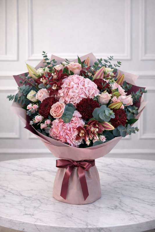 This luxurious design features statement pink hydrangea, delicate blush roses, striking burgundy chrysanthemums, elegant cymbidium orchids, and seasonal foliage, finished with eucalyptus for a fresh, contemporary feel. Hand-tied and gift-wrapped in soft blush paper with a satin ribbon, this bouquet arrives ready to delight.