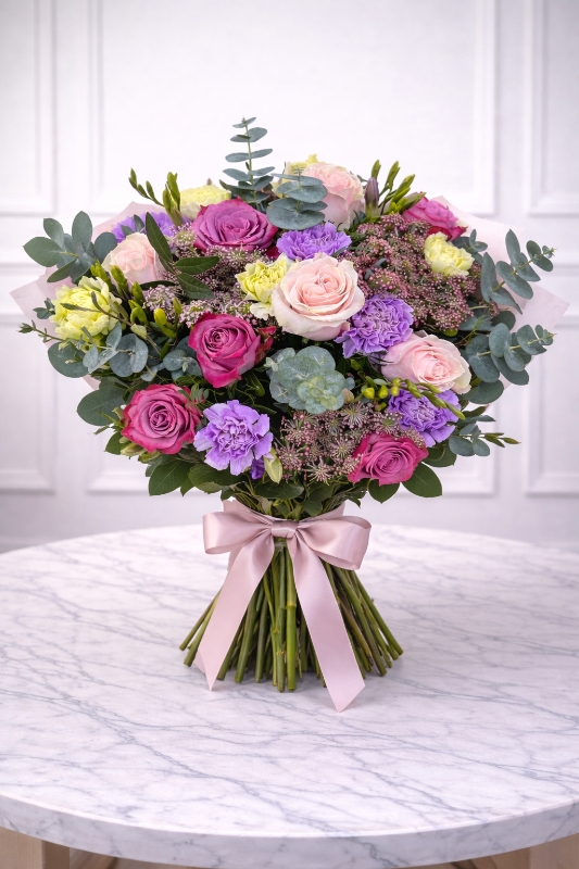 Featuring a harmonious mix of premium roses, carnations, lisianthus, seasonal accent flowers, and fresh eucalyptus foliage, this bouquet offers depth, colour, and natural movement. The carefully selected palette of blush pinks, lilacs, soft purples, and creamy pastels creates a romantic yet contemporary look, finished with luxury wrapping and a satin ribbon for an elevated presentation.