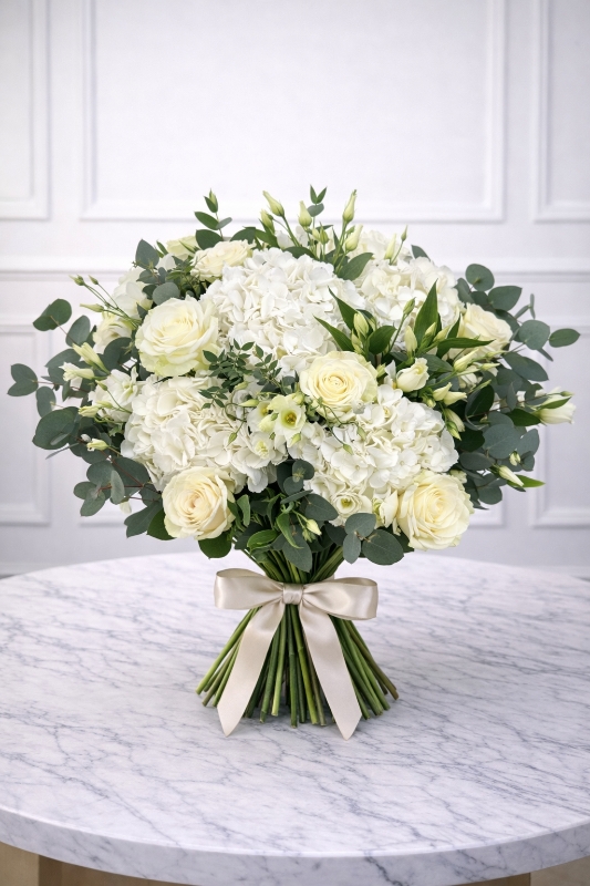 Graceful, timeless and beautifully refined, our Luxury White Rose & Hydrangea Bouquet is a sophisticated arrangement designed to express elegance, comfort and heartfelt sentiment. Handcrafted by our expert florists, this bouquet features lush white hydrangeas, premium ivory roses and delicate seasonal blooms, perfectly complemented by fresh eucalyptus foliage.