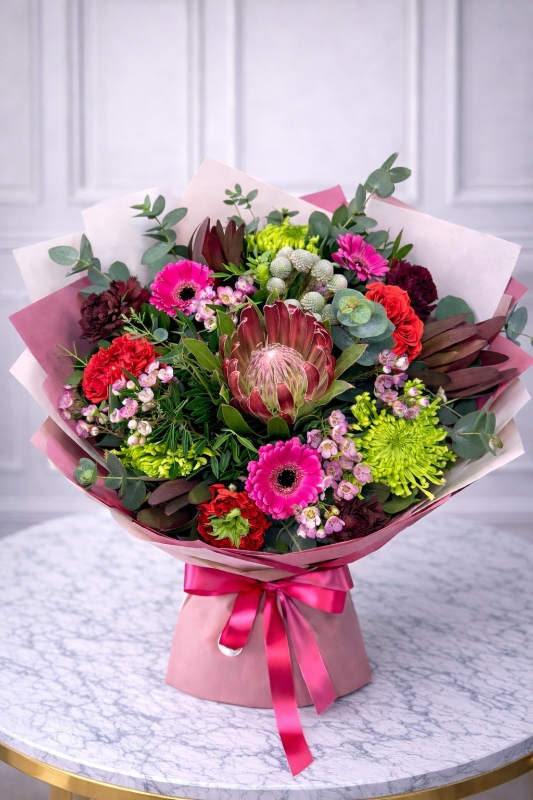 The protea, known for symbolising strength, courage and transformation, creates a bold focal point, while the surrounding vibrant tones bring energy, depth and modern elegance. Carefully handcrafted by our expert florists, this bouquet offers exceptional structure, movement and visual impact from every angle.